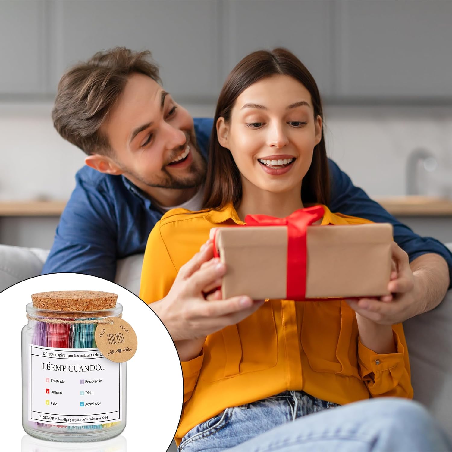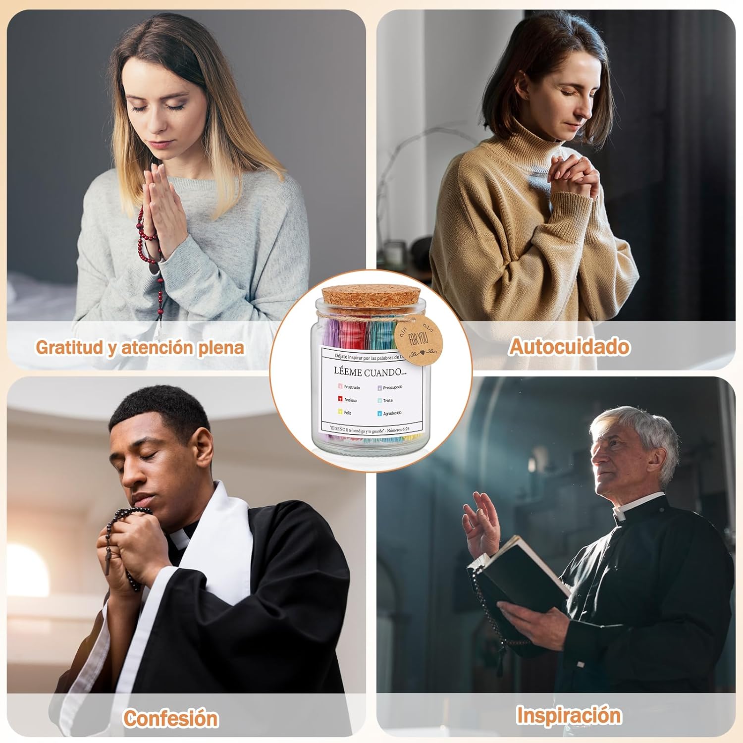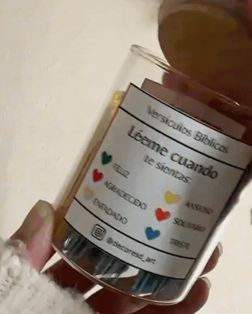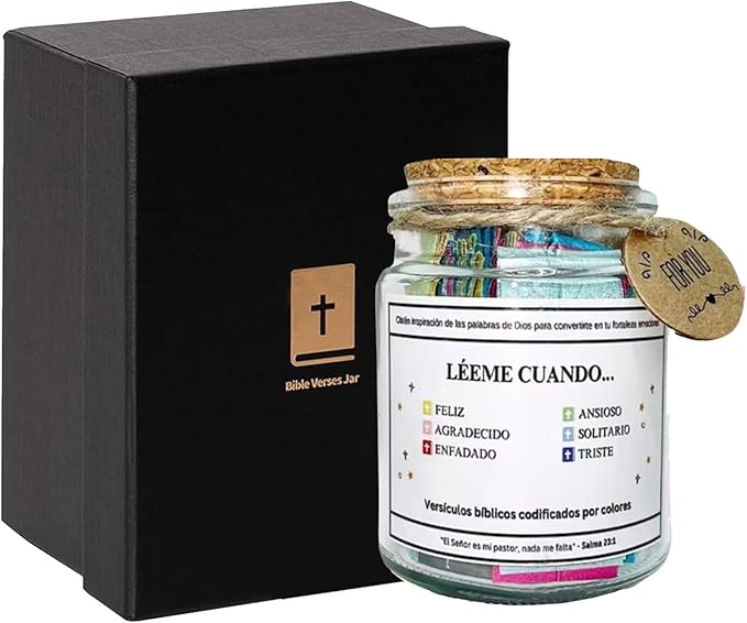 Cada frasco guarda mensajes de la Palabra que pueden acompañarte en cualquier momento del día. Elige el color que refleje tu sentir, abre el versículo y permite que su luz te hable en silencio. No es un objeto para coleccionar, sino un espacio de pausa, de escucha y de conexión. Su diseño simple y sus tonos suaves lo hacen ideal para tu altar, tu escritorio o como regalo lleno de presencia.